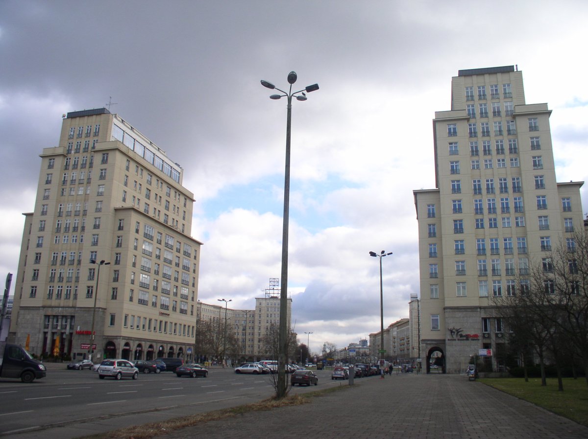 Ever since there was traffic between Berlin and Frankfurt a/d Oder, there must have been a -about 100 kilometer long- road between these cities. Since Berlin’s expansion around 1700, it was named the Frankfurter Straße – and since the late 1780s, a part was named the Große Frankfurter Straße. City’s gates came and went, barricades were thrown up and blasted down. The (Große) Frankfurter Straße had a serious history – until a heavy air-raid at the 3rd of February 1945 wiped out most of it. Yet, this all is only a prehistory of the Stalinallee – as the street was called since December 1949.
