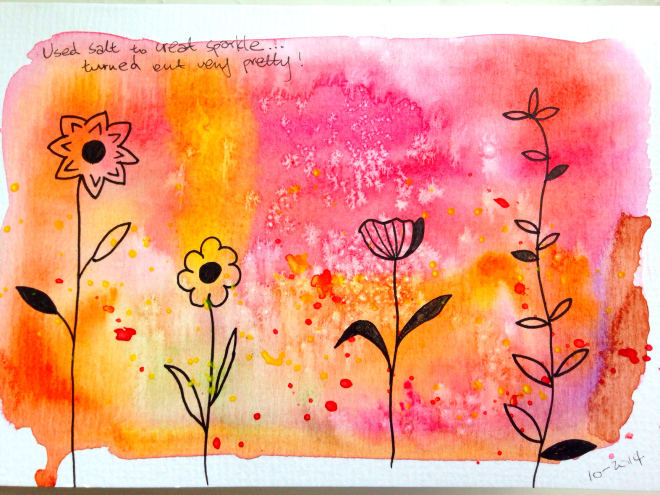 Wet on wet background with salt sprinkles for the sparkling effect, and ink flower drawings on top once background has dried