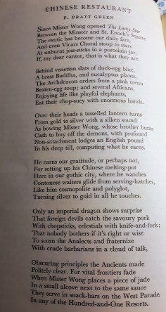 This interesting poem seems to be set in some town with spires and appearing in the early sixties examines the racial tensions between the conventional attitudes of the clerical customers in the slightly exotic atmosphere of the restaurant and those of the Chinese staff. Its tone is sardonic and wistful. There is a definite culture clash going on as well as some confusion over philosophies and belief systems.
