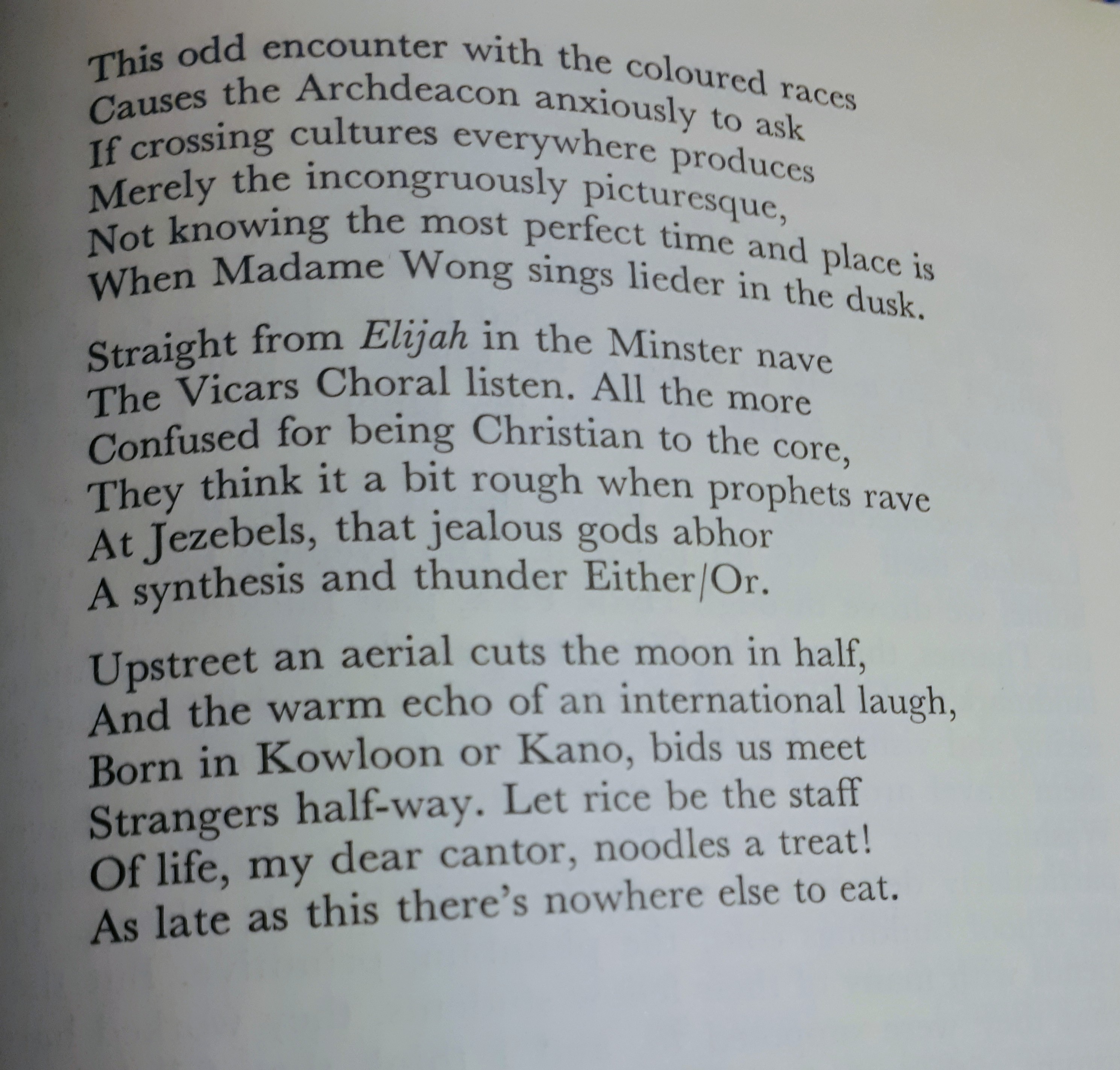 This interesting poem seems to be set in some town with spires and appearing in the early sixties examines the racial tensions between the conventional attitudes of the clerical customers in the slightly exotic atmosphere of the restaurant and those of the Chinese staff. Its tone is sardonic and wistful. There is a definite culture clash going on as well as some confusion over philosophies and belief systems.
