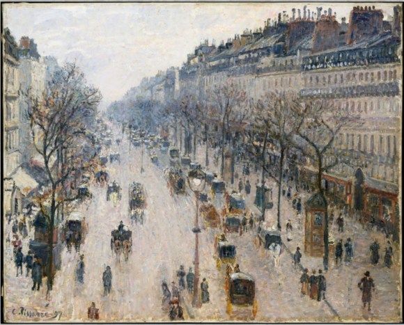 After spending six years in rural Éragny, Pissarro returned to Paris, where he painted several series of the grands boulevards. Surveying the view from his lodgings at the Grand Hôtel de Russie in early 1897, Pissarro marveled that he could “see down the whole length of the boulevards” with “almost a bird’s-eye view of carriages, omnibuses, people, between big trees, big houses that have to be set straight.” ()