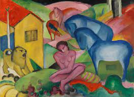 These first eleven lines interweave the process of getting up for breakfast with the contrasts in the outside landscape. Being cold and having no clothes on and breakfast itself – perhaps “Frosties” (crunch sucrose flake) and perhaps a suggestion of tiredness or exhaustion. The gradual awakening takes place with engaging contrasts as Padel makes clear in her own interpretation. There is cold sharpness against and before the sunlight. There are contrasting colours orange-yellow with the blue flanks of the horses. An image which might suggest the paintings of Franz Marc.