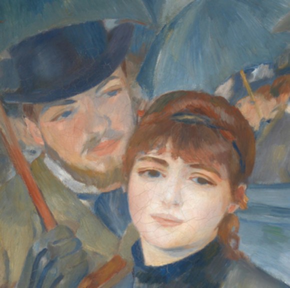 “Painted in two stages, with a gap of around four years between each stage, it shows the change in Renoir’s art during the 1880s, when he was beginning to move away from Impressionism and looking instead to classical art. The group on the right, which includes a mother and her two daughters and the woman in profile in the centre, is painted in a characteristically Impressionist manner with delicate feathery touches of rich luminous tones. On the left of the composition, completed during the second stage, Renoir adopted a more linear style. The figures here, including the full-length young woman and the man standing behind her, have clearly defined outlines, precisely drawn features and a greater sense of three-dimensional form.”