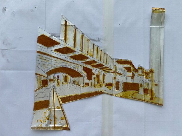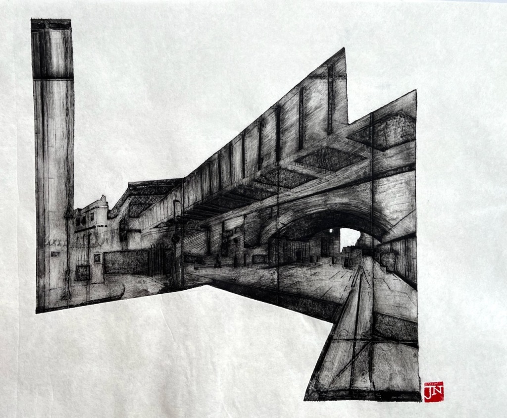I used traditional etching ink, “Shop mix – Bone Black” from Intaglio Printmaker, whose shop, as it happens, is not far from this railway bridge.