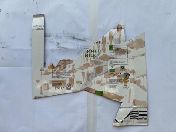 The plate is made by peeling away the metallic substance inside the milk carton, then painting it with shellac to make it stronger. I describe the process in this post.