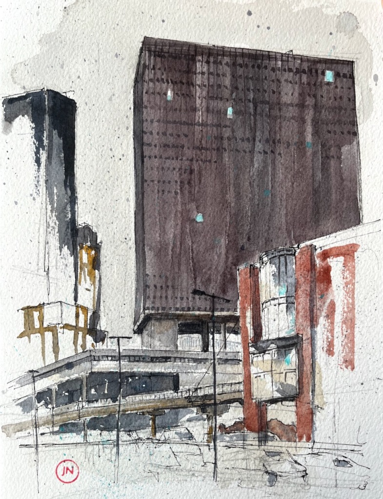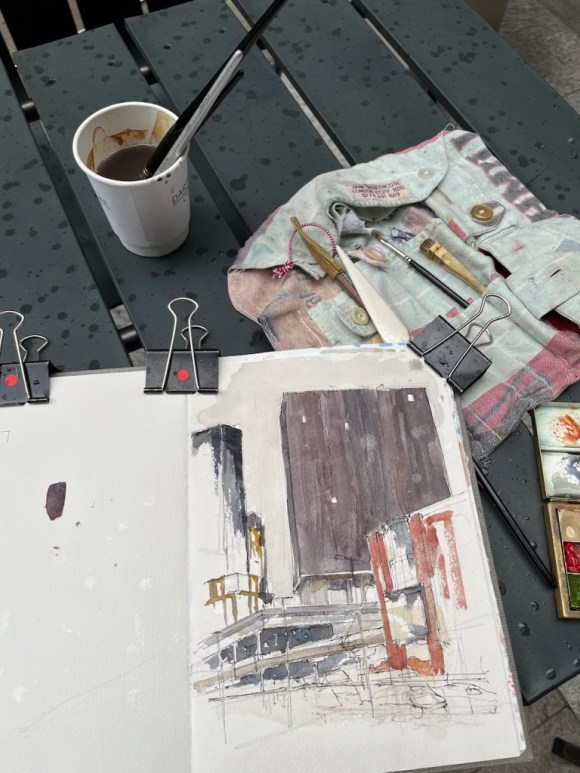 I sketched this from the outside tables at 88 Wood Street. A small coffee shop run by Dartbrooke Coffee has opened in this office block. The coffee was superb, the welcome warm, and they had a selection of food. Also they had tables both indoors and out. Here’s the view from an outdoor table overlooking London Wall.