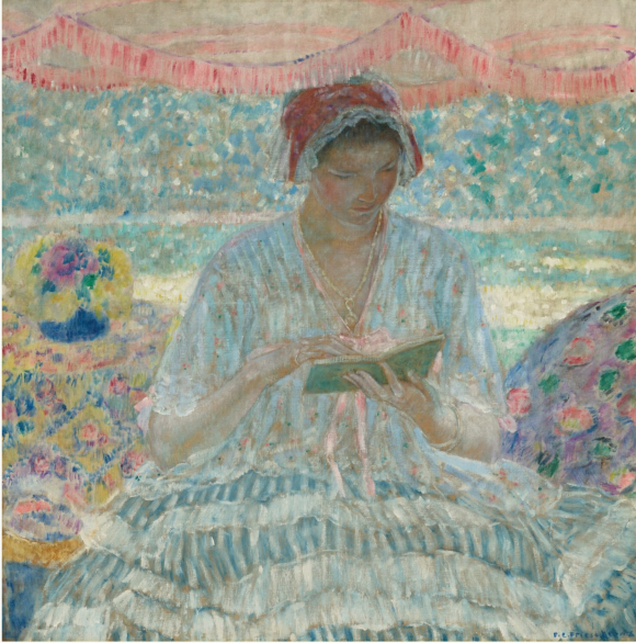 “Frieseke’s celebrated Giverny subjects of women in domestic interiors, or, such as in the present example, enjoying moments of leisure in the village’s opulent gardens, are imbued with a remarkable sense of light and high-keyed palette adopted from the French Impressionists. William H. Gerdts writes, “It was Frieseke who introduced into the repertory of Giverny painting the concern for rich, decorative patterns, related to the art of Edouard Vuillard, Pierre Bonnard, and the other Nabi painters. There are patterns of furniture, patterns of parasols, patterns of fabric and wall coverings, patterns of light and shade, and patterns of flowers, all played off one against another in bright sunshine…” (Monet’s Giverny: An Impressionist Colony, New York, 1993…