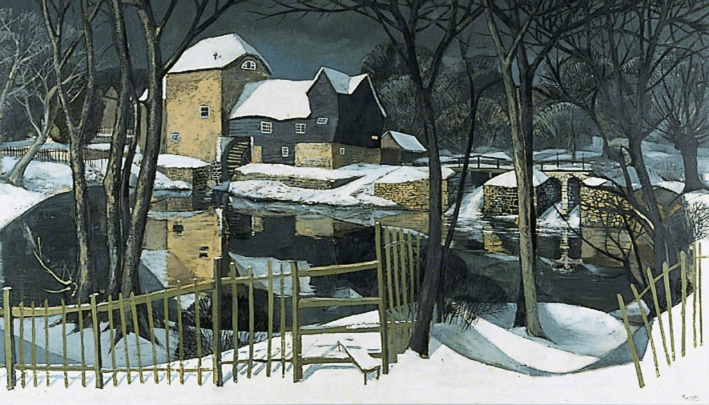 I recently happened upon these rather homely images of the English countryside, colourful and imaginative. They seem in the same vein as John Nash and perhaps Stanley Spencer. The falling leaves in front of the Mill House, the stream and the pathway adds a certain timeless quality, slightly abstract and yet impressively lyrical. You can read more about this charming painter’s background at https://artuk.org/discover/artists/barnden-bruce-19252009