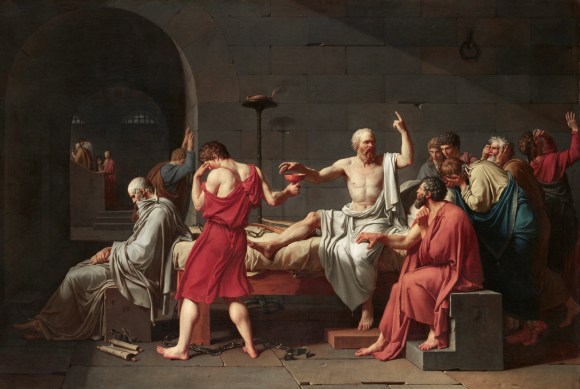 “In this landmark of Neoclassical painting from the years immediately preceding the French Revolution, David took up a classical story of resisting unjust authority in a sparse, frieze-like composition. The Greek philosopher Socrates (469–399 B.C.) was convicted of impiety by the Athenian courts; rather than renounce his beliefs, he died willingly, discoursing on the immortality of the soul before drinking poisonous hemlock.”