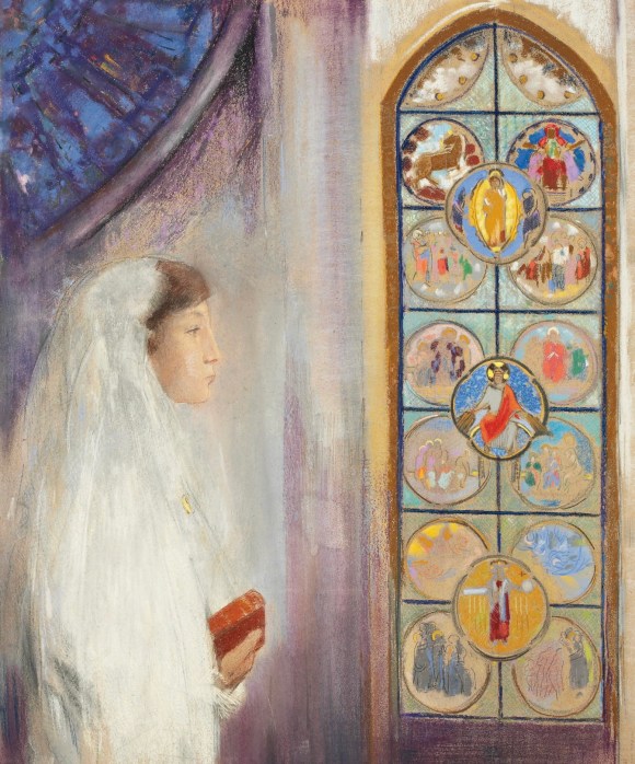 “…Simone Fayet, Gustave Fayet’s daughter, is represented taking her first communion in front of a backdrop of stained glass. Like the portrait which Redon had painted of her two years earlier, Simone Fayet avec sa poupe, the young girl’s expression is serious and thoughtful...The composition of the work is unusual. Simone, seen in profile, occupies only the first third of the composition, the rest being devoted to scenery...the stained glass occupying half of the work is directly inspired by the stained glass at Chartres, for it was during a visit to the cathedral there with Fayet in June 1908 that the artist was commissioned to paint the portrait of his…
