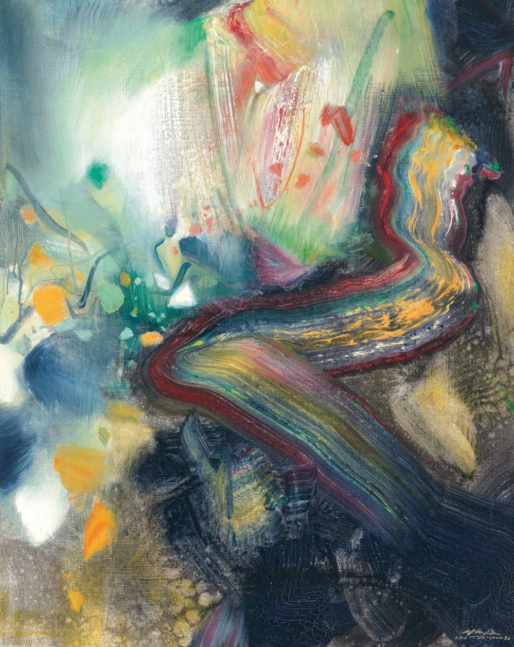 “The outbreak of the First World War found Robert and Sonia Delaunay vacationing in the Spanish resort of San Sebastián. After spending some time in Madrid, they lived from June 1915 to March 1916 in the Portuguese village of Vila do Conde, near Oporto. Both painters were fascinated by the warm, clear light of northern Portugal, which they captured in a series of paintings of country markets. Although Robert Delaunay had ventured into abstract art in 1912–13, unlike other painters, such as Kandinsky and Kupka, he never saw abstraction as an end in itself. Here, figurative and abstract elements merge to enhance the dynamic arrangement of colour. Delaunay maximised colour saturation by mixing oil with wax, a technique he abandoned after his stay in Portugal.”