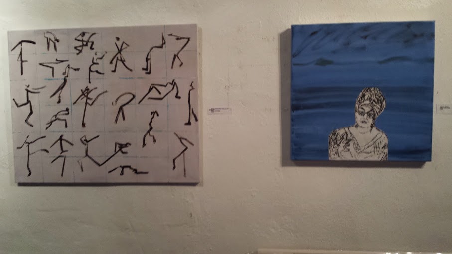 production. http://www.baacorsham.co.uk/mparkin/p65.htm and also her film work for Isodora is at http://www.imdb.com/name/nm0685496/ Mary Fletcher’s paintings too look a little like dancing musical characters against a colourful background grid. There are also a number of interesting sculptures and small figurines in the exhibition which are also worthy of attention.