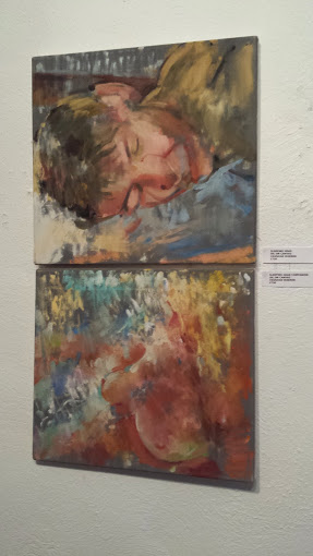Once again, Vaughan Warren, educated at the Royal Academy Schools (The RA Schools was founded in 1769, and remains independent to this day. This independence enables the Schools to offer the only three-year postgraduate programme in Europe.) has turned in a range of varied and intriguing work. Two of his pictures, I found particularly appealing, although it is worth remarking that all his paintings, like his self-portrait in the manner of Cezanne, benefit from his wide knowledge of art history. The first portrays a sleeping head surmounted delicately above a breast in a transport of lovely colours. This evocative duo puts one in mind of those lovely lines from W.H.Auden:-