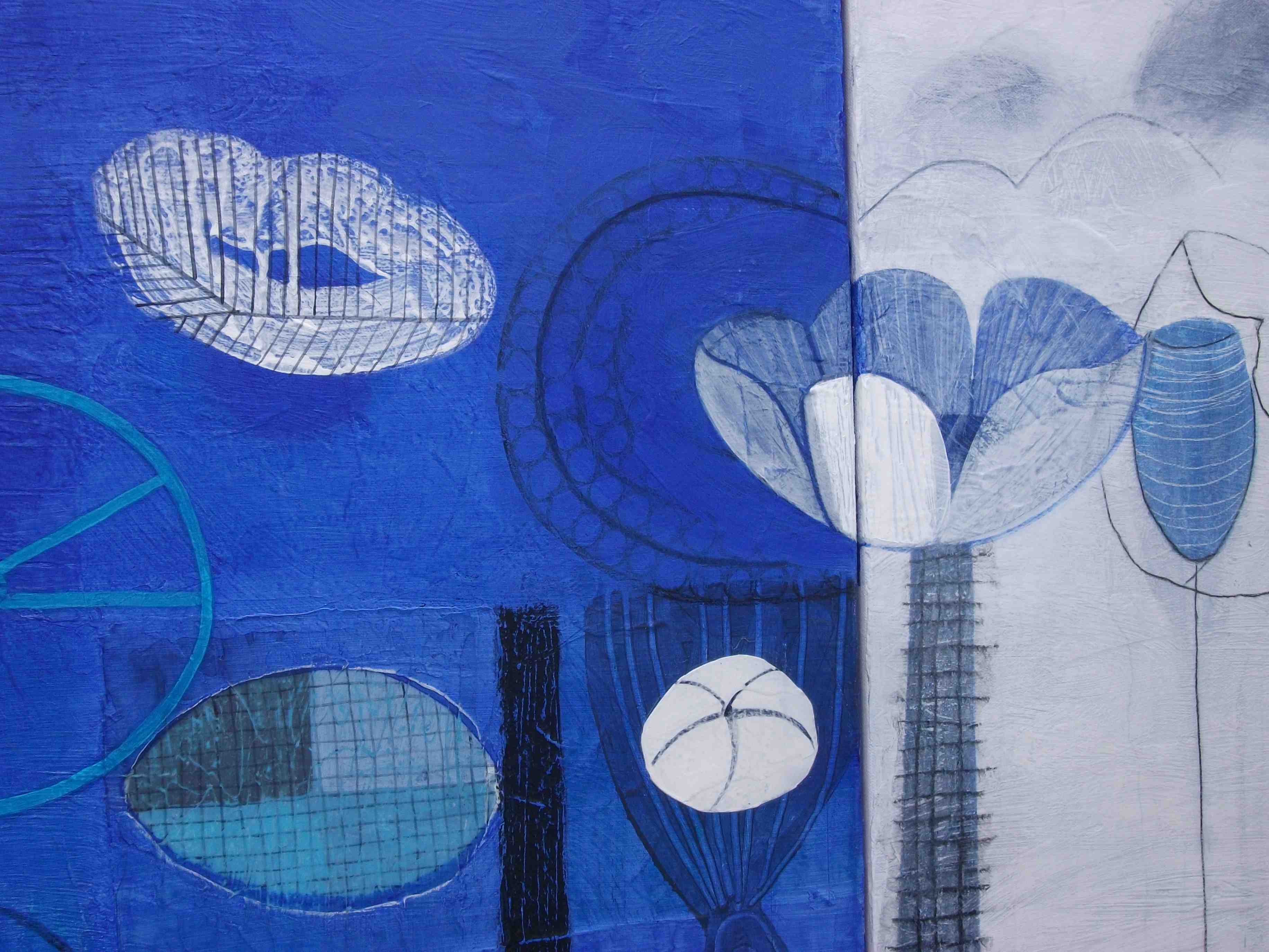 Her first solo show was in Brown’s Restaurant which Maggie then proceeded to show at for another two more years and then had a further displays at Avalon in Marazion. Her very abstract colourist compositions at this point were very much influenced by her attraction to Patrick Heron’s work. In particular Maggie likes his later garden works and the space and depth created in these compositions. Paul Nash, Samuel Palmer, William Blake and Sutherland remain her favourite works for their pastoral, lyrical qualities. She remains interested in printing, ceramics and expresses an interest too in sculpture.