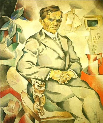 Rossine’s self portrait was painted when he was just nineteen. The work already shows his movement towards a orphic style although his palette is not that far away from the colours employed by Nathan Altman in his The Ziger Macher (the watch mender). The notes from Hammersite.com suggest that this particular portrait was painted about 1914 and go on to say,” The painting is from the period Altman exhibited with The Jack of Diamonds group and attempted to express Jewish national identity utilizing a contemporary style. “