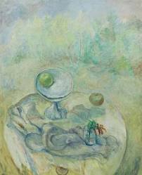 However, for those interested in the development of the work of Paul Nash, his oil painting, “The Archer” will doubtless attract attention both for its muted complementary colours and the charmingly odd bucolic setting. A friend comments in a personal communication, “The Nash is one of his complex compositions worked on for years with bits from all over the place. There is a letter by Nash about it in Tate Archives. The central ‘archer’ feature was a structure he made from an old toy boat, glass tube, twig, seaweed etc. I don’t think it exists anymore other than as a photo. It looks more compelling in the photo with strong echoes of surrealist sculptures by Giacometti, Man Ray etc. He constructed (like Lanyon), collected and photographed sculptural objects from which he derived elements of his paintings.