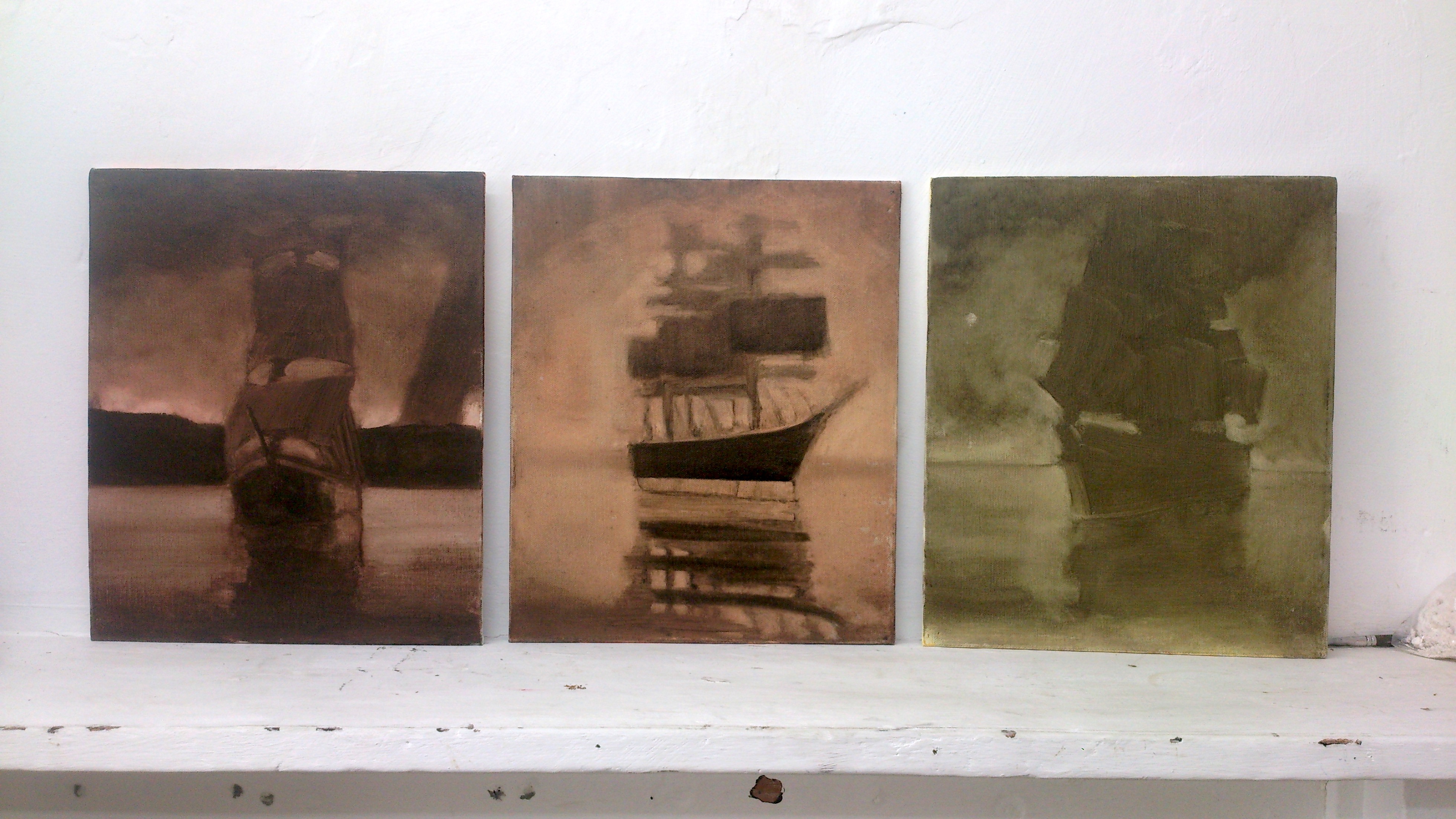 Currently, Louise Thomas has just completed a three month placement at Porthmeor Studios where her work has focussed largely upon an historical approach to the coastal landscape including ships and shipwrecks. About her work, Louise has written,”I construct magical realist narratives through collages, sculpture and painting. The enviroments or events depicted show contrast between real and magical elements. These elements are visible through my different methods of production and placement of resources. I find inspiration from a wide range of source material, from films I have made of abandoned interior spaces, to specific walking routes, to archive material of paintings hanging in museums. I perform extensive research and careful study of the subject matter, building a pool of scenarios to work from.”