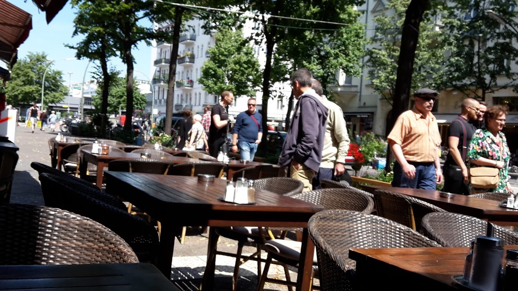 As most of Schoenefeld prepared for a huge Rainbow Festival, I ventured out into the neighbouring streets through Massenstrasse to the good-humoured crowd in Winterfeld Market. There was some comical exchanges between the punters and the stall holders. Myself, I was looking for a new and cheap hat to relieve the heat from the powerful Sun. There were plenty of hats on sale; I had lost a lovely hat that my daughter had given me in a windy day at Wansee when my beautiful, smart and I thought English looking hat was taken by a Windstoß or Böe blew my hat into a gated secluded villa. In the market there was a variety of hats for sale and yet more expensive at around 15 Euros than I wanted to pay-for just a few days. I thought I found what I was looking for only to discover it was fuer Kinder-and didn’t fit meine klein Kopf!