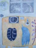 Arriving this sunny morning at Sarah Brittain’s delightful gallery in Parade Street Penzance, my attention was drawn to Simon Turner’s bearded “Landlady” painted on found panel. Many of these pictures seem to have a Victorian or Edwardian quality, perhaps a little reminiscent of Monty Python. These reminded me a little of Adam Birtwistle’s portraits which I had recently seen displayed at King’s Place, http://whosjack.wpengine.com/wp-content/uploads/2010/01/adam.png especially in relation to the horizontal structuring of the composition. Simon’s surreal playfulness shown in several zany mosaics are a nostalgic investigation into time, dream and reminiscence. I particularly liked “Man sending an e-mail”.