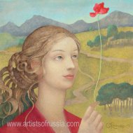 In “Garden Light”, Orishnikov has depicted an ingenue, endearingly innocent amongst a cavern of leaves, peering into the distance under her straw bonnet and surrounded by blossoming mauve flowerheads. She clasps her hands in a gesture that reinforces her distance as an observer and suggests her naivety. Tragicomedy, flora and contemplation combine in her work to embody an elegant exuberance. This is repeated in “Country Girl” where the girl cherishes a crimson sweet pea and beholds the blossom on the spindling stem.